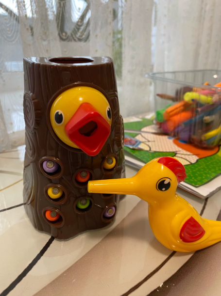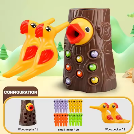 Con su pico magnético, tu peque puede atrapar el gusanito y llevarlo directo al pico del pollito hambriento. Un juego divertido que estimula la motricidad fina, la coordinación ojo-mano y el pensamiento lógico de forma natural. 🐤🌳