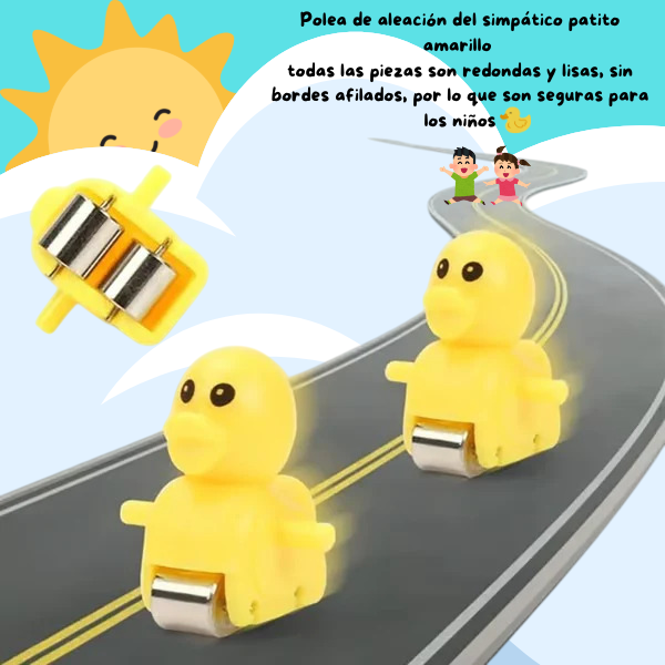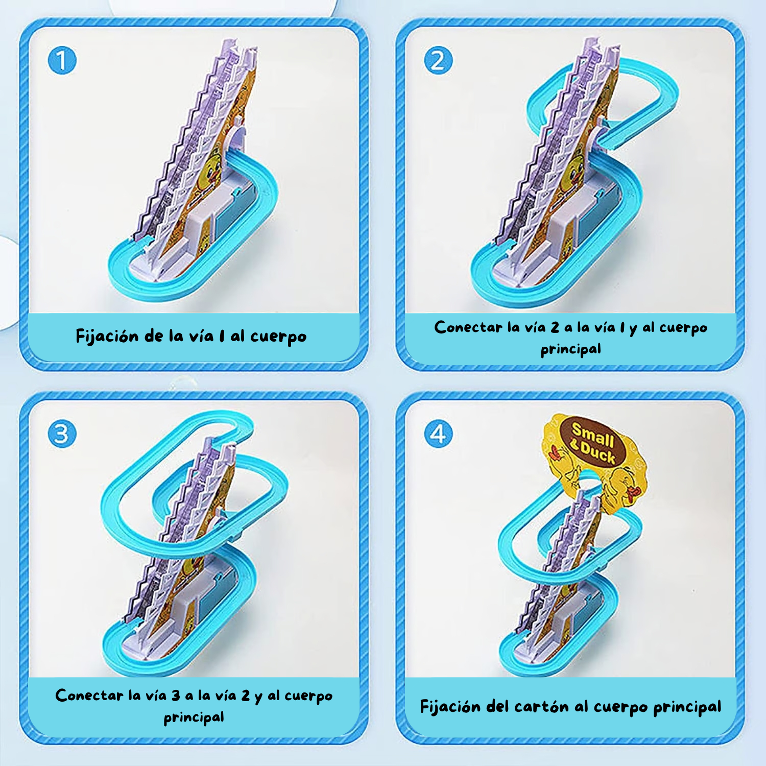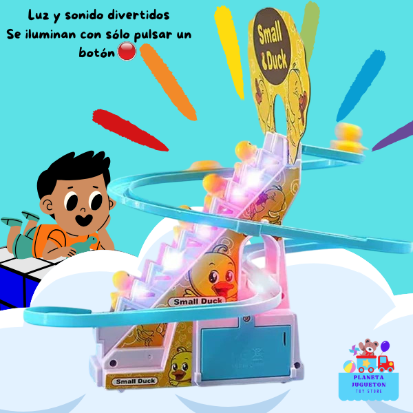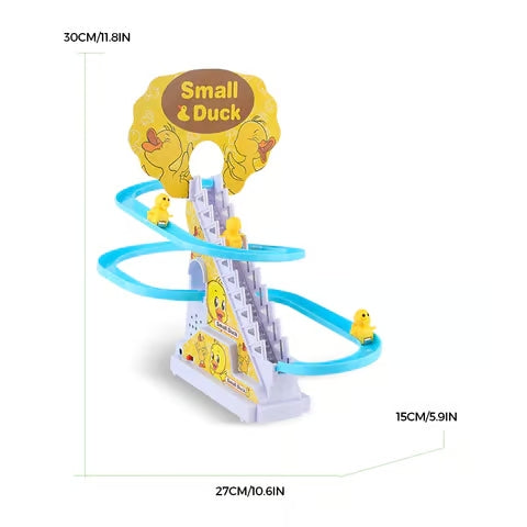 El juego de juguetes de pato está equipado con luces LED intermitentes, el juguete tiene una banda sonora divertida y música alegre (con un botón de encendido/apagado), cuando lo enciendes, el pato subirá la escalera con la música y luego se deslizará por el tobogán.